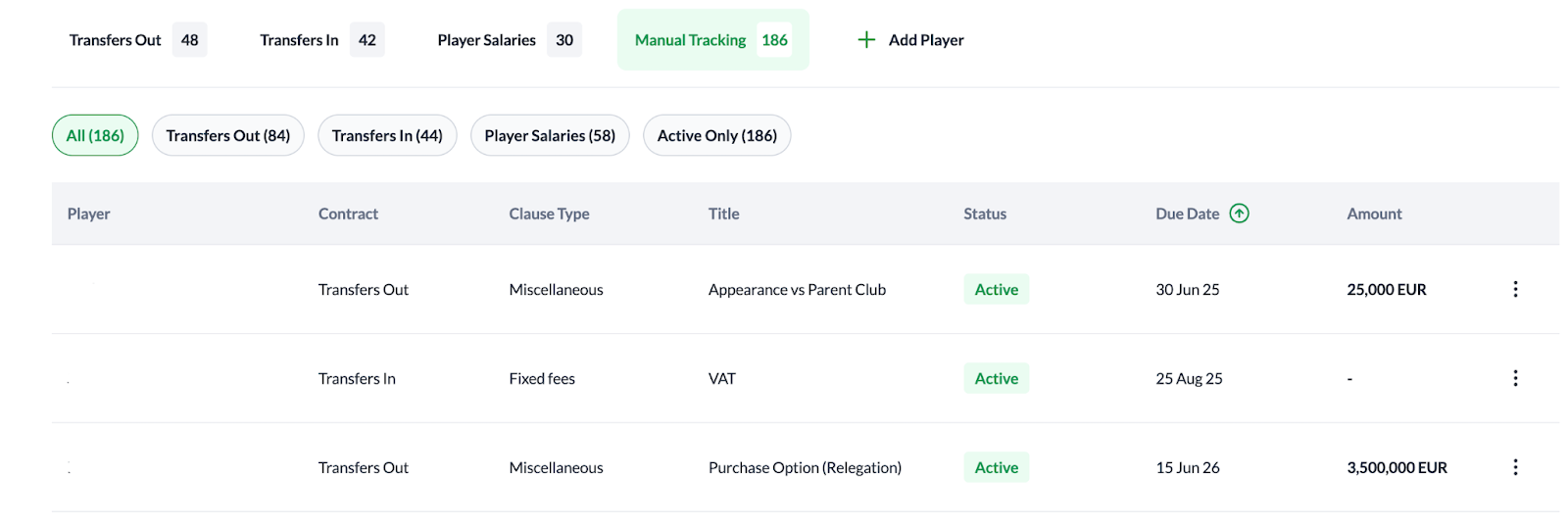 - Quick Filters: You can sort clauses by contract type (Transfers Out, Transfers In, Player Salaries) or view Active Only items to see what is currently outstanding.