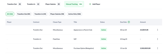 Smart Sorting: To help you prioritize the most valuable or time-sensitive clauses, you can sort the table by Player, Due Date, or Amount.